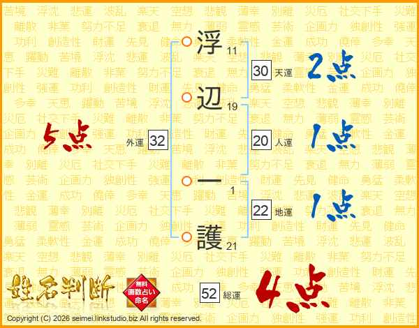 生活面を象徴する運勢です。外部から受ける影響力を表し、結婚運、家庭運や職場、環境への順応性を表します。総運から人運を引いた画数。姓や名が1文字の場合を除く。