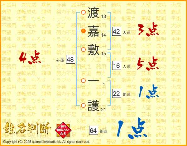 生活面を象徴する運勢です。外部から受ける影響力を表し、結婚運、家庭運や職場、環境への順応性を表します。総運から人運を引いた画数。姓や名が1文字の場合を除く。