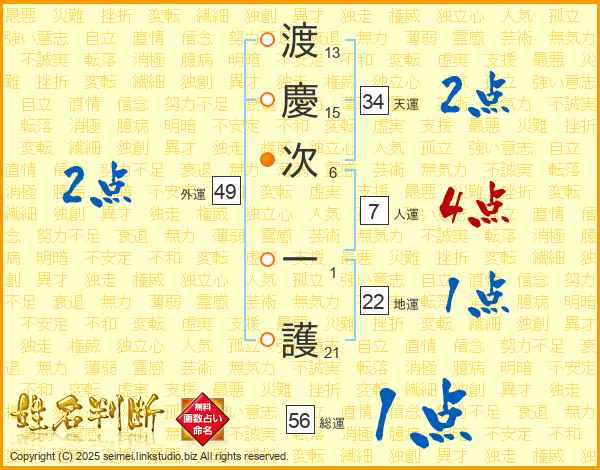 渡(13画)慶(15画)次(6画) 一(1画)護(21画)