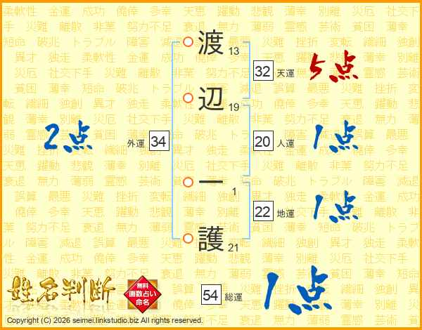 生活面を象徴する運勢です。外部から受ける影響力を表し、結婚運、家庭運や職場、環境への順応性を表します。総運から人運を引いた画数。姓や名が1文字の場合を除く。