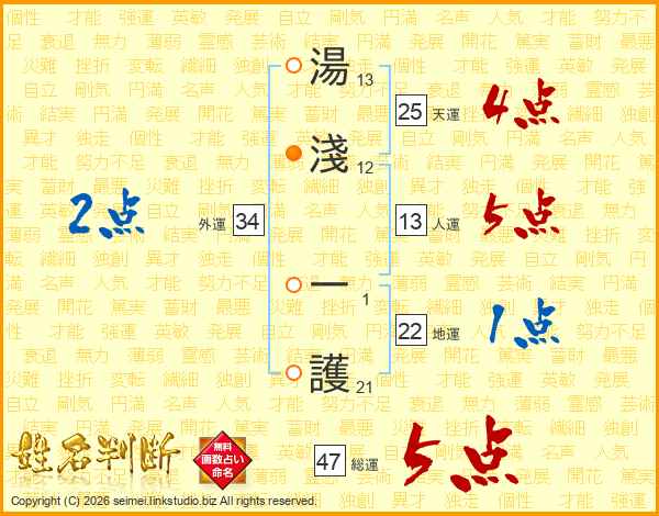 生活面を象徴する運勢です。外部から受ける影響力を表し、結婚運、家庭運や職場、環境への順応性を表します。総運から人運を引いた画数。姓や名が1文字の場合を除く。