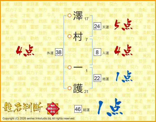 生活面を象徴する運勢です。外部から受ける影響力を表し、結婚運、家庭運や職場、環境への順応性を表します。総運から人運を引いた画数。姓や名が1文字の場合を除く。