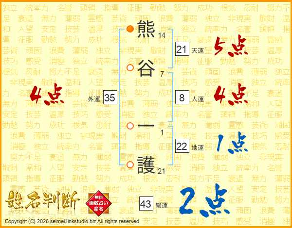 熊谷一護さんの総運は43画の2点!