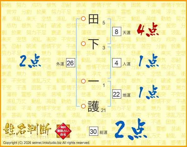 生活面を象徴する運勢です。外部から受ける影響力を表し、結婚運、家庭運や職場、環境への順応性を表します。総運から人運を引いた画数。姓や名が1文字の場合を除く。