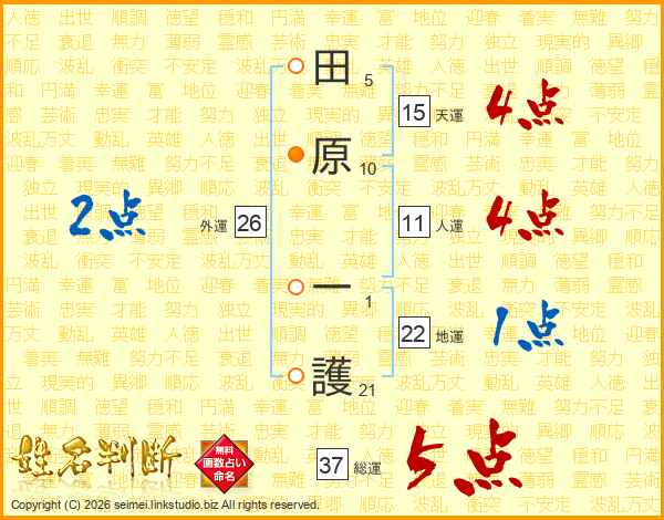 あなたの人生を表す1番重要な運勢です。生涯を通じて影響する総合運となり、主に50歳以降の晩年期に影響を及ぼします。苗字と名前の合計画数。