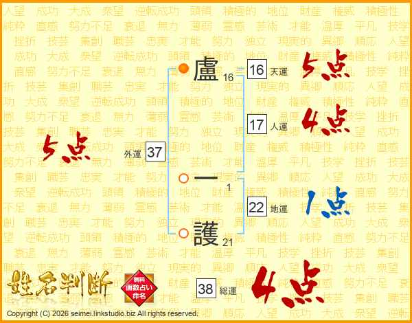 盧一護さんの総運は38画の4点!