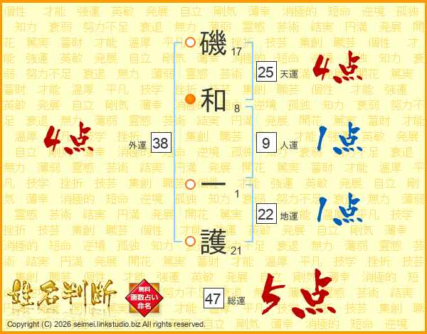 生活面を象徴する運勢です。外部から受ける影響力を表し、結婚運、家庭運や職場、環境への順応性を表します。総運から人運を引いた画数。姓や名が1文字の場合を除く。