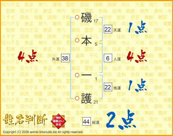 生活面を象徴する運勢です。外部から受ける影響力を表し、結婚運、家庭運や職場、環境への順応性を表します。総運から人運を引いた画数。姓や名が1文字の場合を除く。