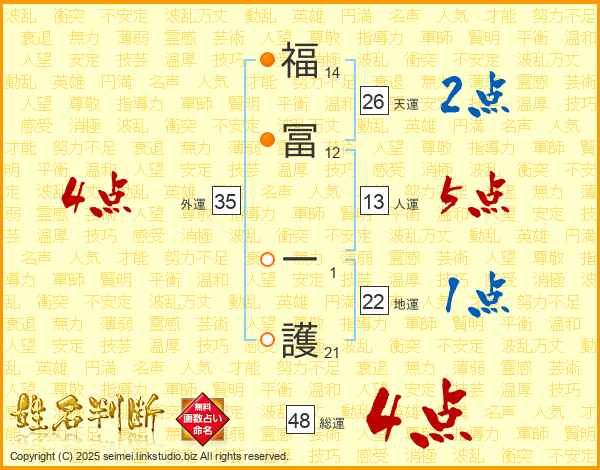 生活面を象徴する運勢です。外部から受ける影響力を表し、結婚運、家庭運や職場、環境への順応性を表します。総運から人運を引いた画数。姓や名が1文字の場合を除く。