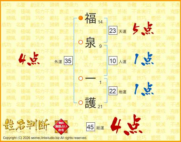 生活面を象徴する運勢です。外部から受ける影響力を表し、結婚運、家庭運や職場、環境への順応性を表します。総運から人運を引いた画数。姓や名が1文字の場合を除く。