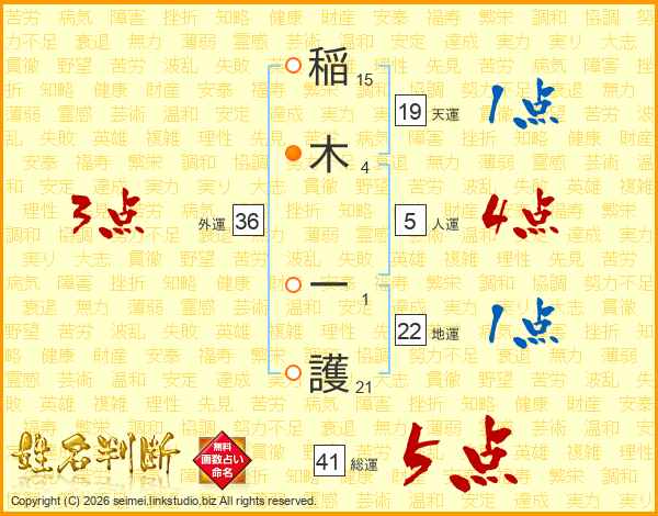 生活面を象徴する運勢です。外部から受ける影響力を表し、結婚運、家庭運や職場、環境への順応性を表します。総運から人運を引いた画数。姓や名が1文字の場合を除く。