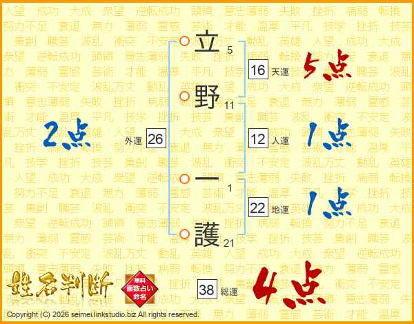 生活面を象徴する運勢です。外部から受ける影響力を表し、結婚運、家庭運や職場、環境への順応性を表します。総運から人運を引いた画数。姓や名が1文字の場合を除く。