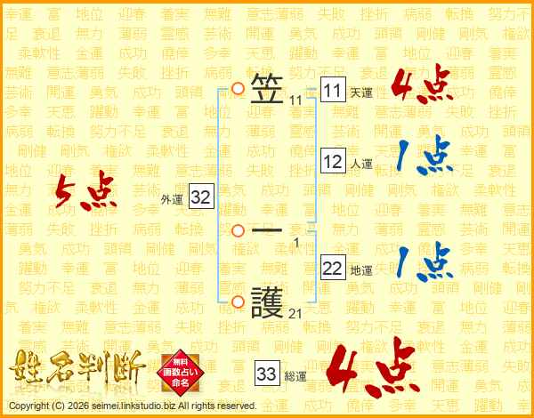 笠一護さんの総運は33画の4点!