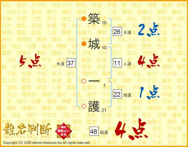 生活面を象徴する運勢です。外部から受ける影響力を表し、結婚運、家庭運や職場、環境への順応性を表します。総運から人運を引いた画数。姓や名が1文字の場合を除く。