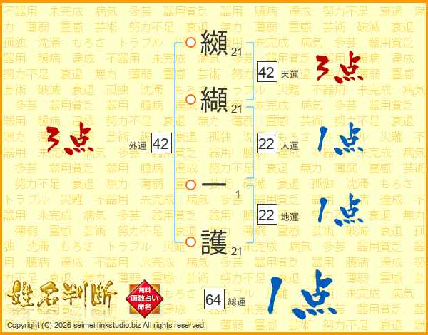 生活面を象徴する運勢です。外部から受ける影響力を表し、結婚運、家庭運や職場、環境への順応性を表します。総運から人運を引いた画数。姓や名が1文字の場合を除く。