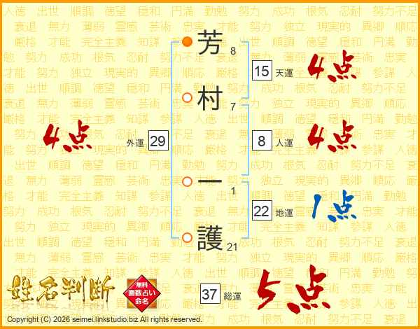 生活面を象徴する運勢です。外部から受ける影響力を表し、結婚運、家庭運や職場、環境への順応性を表します。総運から人運を引いた画数。姓や名が1文字の場合を除く。