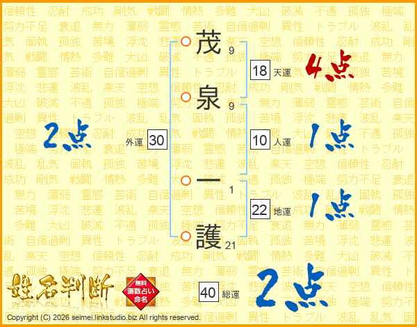 あなたの人生を表す1番重要な運勢です。生涯を通じて影響する総合運となり、主に50歳以降の晩年期に影響を及ぼします。苗字と名前の合計画数。