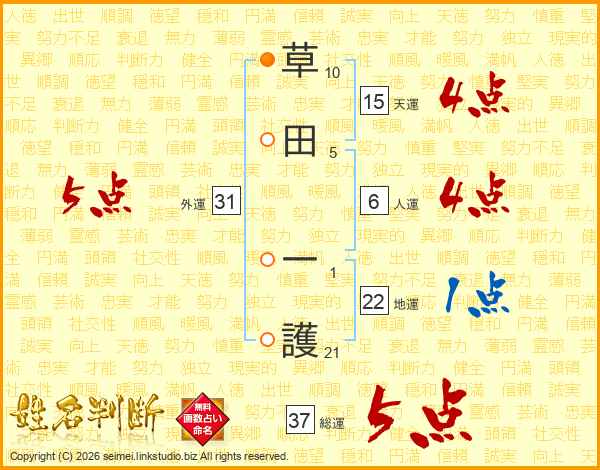 生活面を象徴する運勢です。外部から受ける影響力を表し、結婚運、家庭運や職場、環境への順応性を表します。総運から人運を引いた画数。姓や名が1文字の場合を除く。