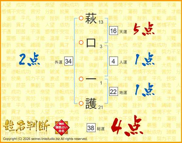 あなたの人生を表す1番重要な運勢です。生涯を通じて影響する総合運となり、主に50歳以降の晩年期に影響を及ぼします。苗字と名前の合計画数。