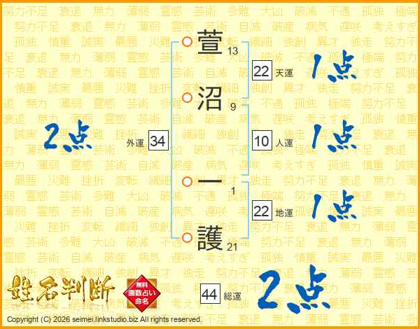 生活面を象徴する運勢です。外部から受ける影響力を表し、結婚運、家庭運や職場、環境への順応性を表します。総運から人運を引いた画数。姓や名が1文字の場合を除く。
