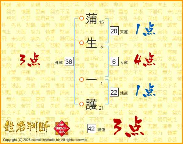 生活面を象徴する運勢です。外部から受ける影響力を表し、結婚運、家庭運や職場、環境への順応性を表します。総運から人運を引いた画数。姓や名が1文字の場合を除く。