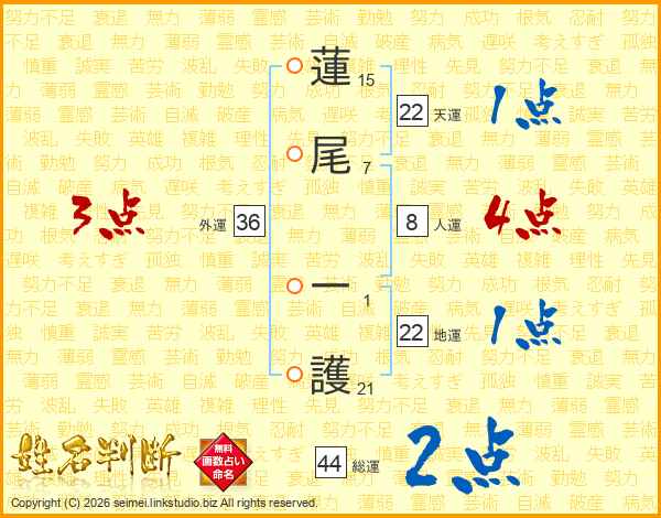 蓮(15画)尾(7画) 一(1画)護(21画)