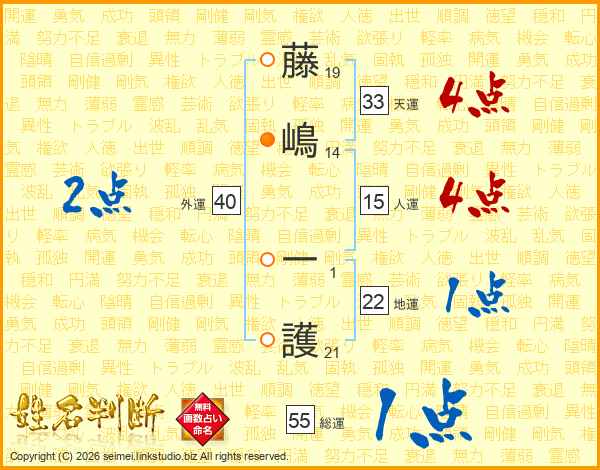 藤(19画)嶋(14画) 一(1画)護(21画)
