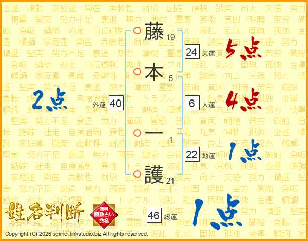 生活面を象徴する運勢です。外部から受ける影響力を表し、結婚運、家庭運や職場、環境への順応性を表します。総運から人運を引いた画数。姓や名が1文字の場合を除く。
