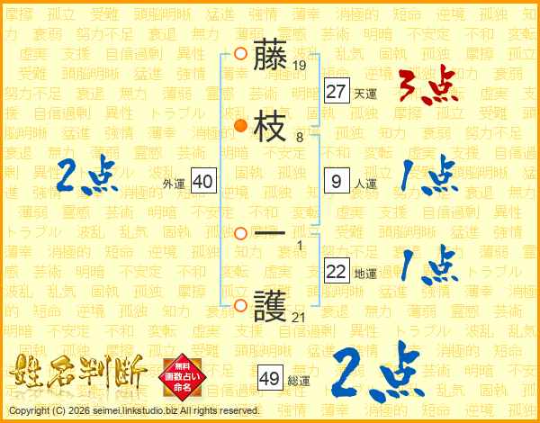 藤(19画)枝(8画) 一(1画)護(21画)