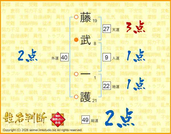 生活面を象徴する運勢です。外部から受ける影響力を表し、結婚運、家庭運や職場、環境への順応性を表します。総運から人運を引いた画数。姓や名が1文字の場合を除く。
