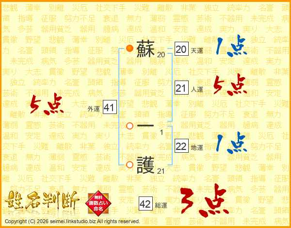 生活面を象徴する運勢です。外部から受ける影響力を表し、結婚運、家庭運や職場、環境への順応性を表します。総運から人運を引いた画数。姓や名が1文字の場合を除く。