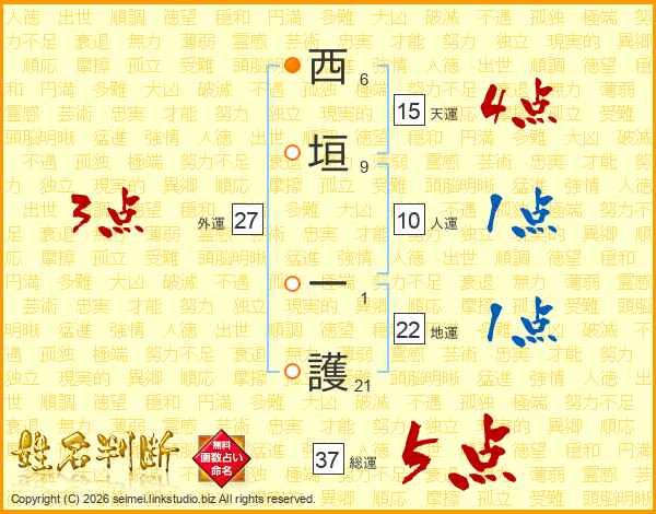 生活面を象徴する運勢です。外部から受ける影響力を表し、結婚運、家庭運や職場、環境への順応性を表します。総運から人運を引いた画数。姓や名が1文字の場合を除く。