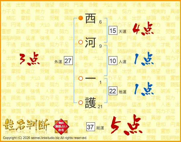 家系が持つ宿命的な運勢を表します。祖先から受け継いだ苗字ですので自分の力が及びません。家柄を象徴します。苗字の合計画数。