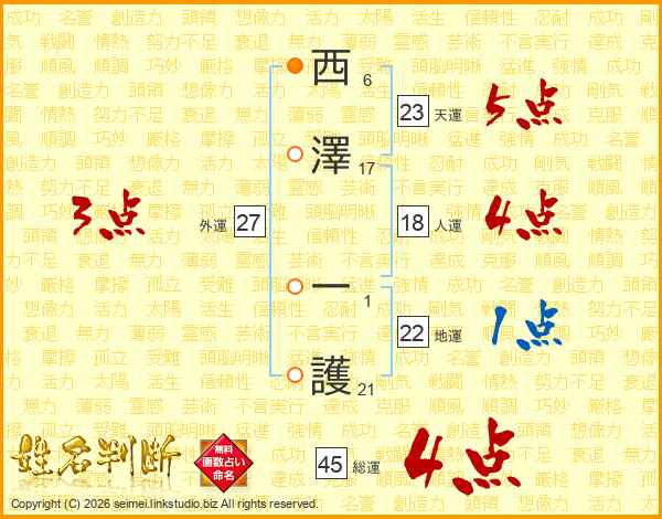 生活面を象徴する運勢です。外部から受ける影響力を表し、結婚運、家庭運や職場、環境への順応性を表します。総運から人運を引いた画数。姓や名が1文字の場合を除く。