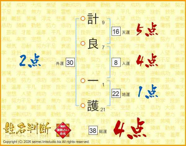 生活面を象徴する運勢です。外部から受ける影響力を表し、結婚運、家庭運や職場、環境への順応性を表します。総運から人運を引いた画数。姓や名が1文字の場合を除く。