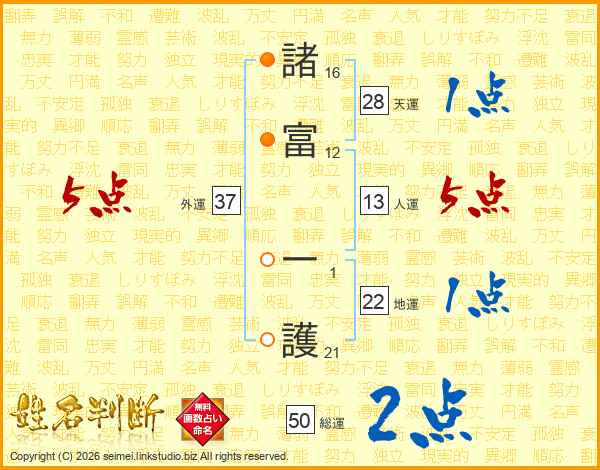 生活面を象徴する運勢です。外部から受ける影響力を表し、結婚運、家庭運や職場、環境への順応性を表します。総運から人運を引いた画数。姓や名が1文字の場合を除く。