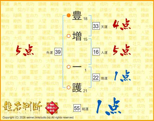 生活面を象徴する運勢です。外部から受ける影響力を表し、結婚運、家庭運や職場、環境への順応性を表します。総運から人運を引いた画数。姓や名が1文字の場合を除く。