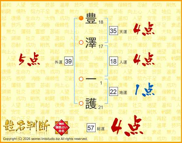 生活面を象徴する運勢です。外部から受ける影響力を表し、結婚運、家庭運や職場、環境への順応性を表します。総運から人運を引いた画数。姓や名が1文字の場合を除く。
