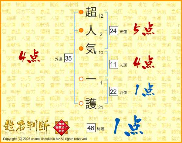 超(12画)人(2画)気(10画) 一(1画)護(21画)