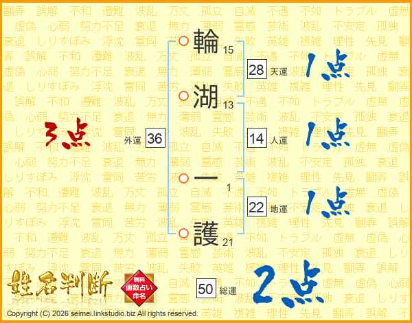 生活面を象徴する運勢です。外部から受ける影響力を表し、結婚運、家庭運や職場、環境への順応性を表します。総運から人運を引いた画数。姓や名が1文字の場合を除く。