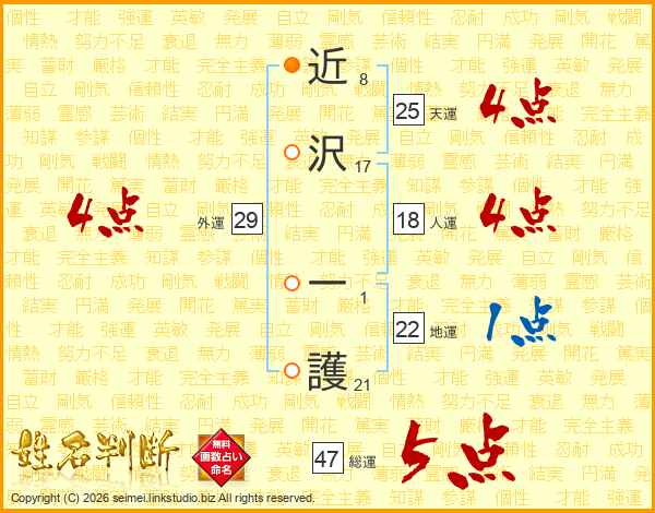 生活面を象徴する運勢です。外部から受ける影響力を表し、結婚運、家庭運や職場、環境への順応性を表します。総運から人運を引いた画数。姓や名が1文字の場合を除く。