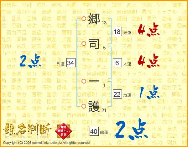 郷(13画)司(5画) 一(1画)護(21画)
