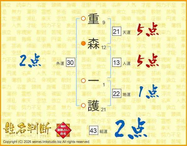 生活面を象徴する運勢です。外部から受ける影響力を表し、結婚運、家庭運や職場、環境への順応性を表します。総運から人運を引いた画数。姓や名が1文字の場合を除く。