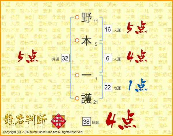あなたの人生を表す1番重要な運勢です。生涯を通じて影響する総合運となり、主に50歳以降の晩年期に影響を及ぼします。苗字と名前の合計画数。