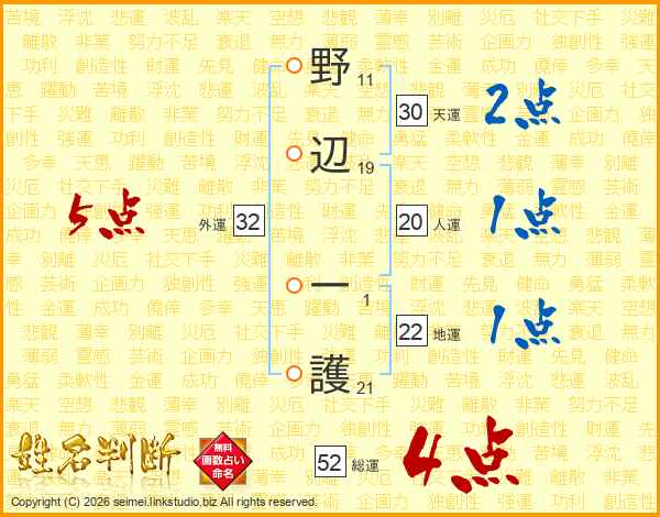 生活面を象徴する運勢です。外部から受ける影響力を表し、結婚運、家庭運や職場、環境への順応性を表します。総運から人運を引いた画数。姓や名が1文字の場合を除く。