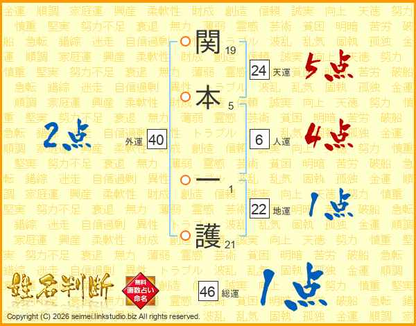 生活面を象徴する運勢です。外部から受ける影響力を表し、結婚運、家庭運や職場、環境への順応性を表します。総運から人運を引いた画数。姓や名が1文字の場合を除く。