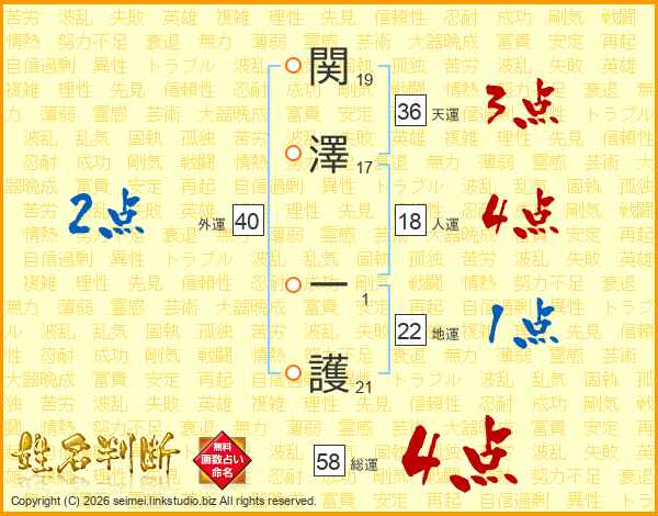 生活面を象徴する運勢です。外部から受ける影響力を表し、結婚運、家庭運や職場、環境への順応性を表します。総運から人運を引いた画数。姓や名が1文字の場合を除く。