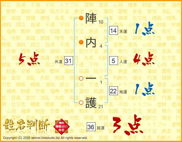 生活面を象徴する運勢です。外部から受ける影響力を表し、結婚運、家庭運や職場、環境への順応性を表します。総運から人運を引いた画数。姓や名が1文字の場合を除く。