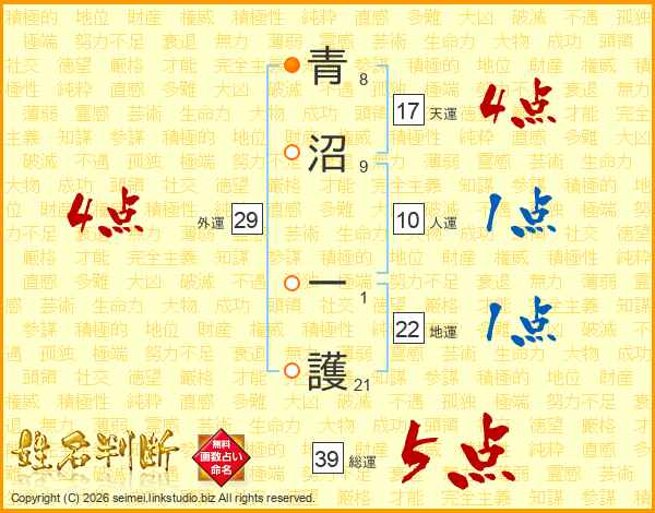 あなたの人生を表す1番重要な運勢です。生涯を通じて影響する総合運となり、主に50歳以降の晩年期に影響を及ぼします。苗字と名前の合計画数。