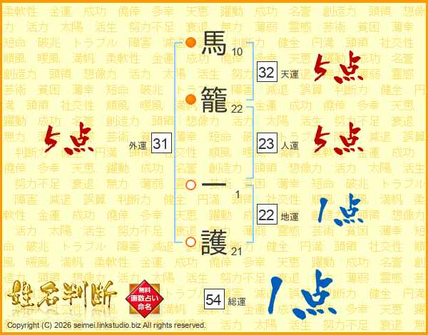 生活面を象徴する運勢です。外部から受ける影響力を表し、結婚運、家庭運や職場、環境への順応性を表します。総運から人運を引いた画数。姓や名が1文字の場合を除く。